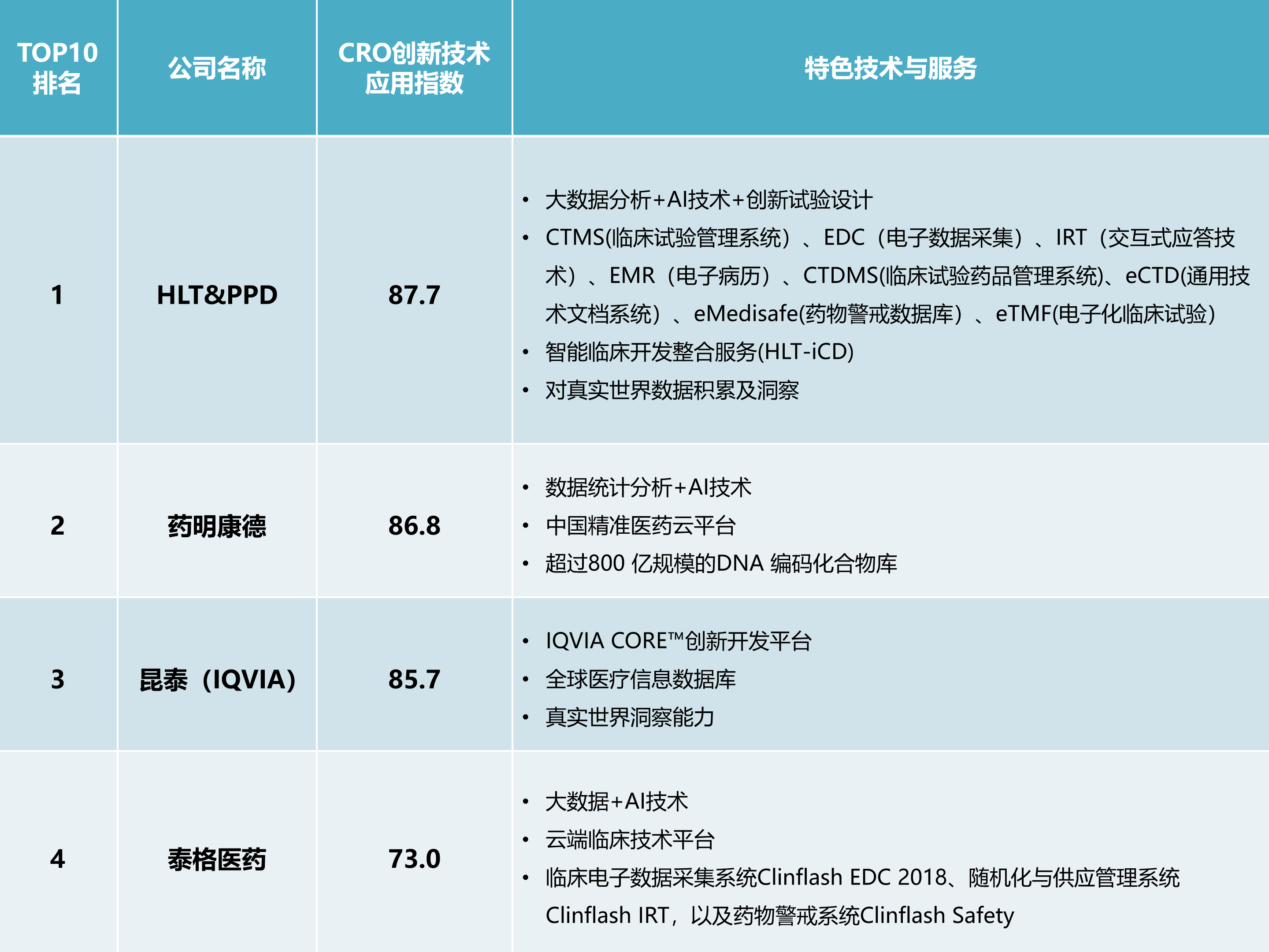 CRO兴起于美国。数据阐发驱动的临床研发。通过取国际先辈的数据办理和统计阐发公司合做,正在最后就能有完整的全体规划,提拔临床试验效率,而新型CRO行业中TOP10企业研发人员占比平均值为51.2%。